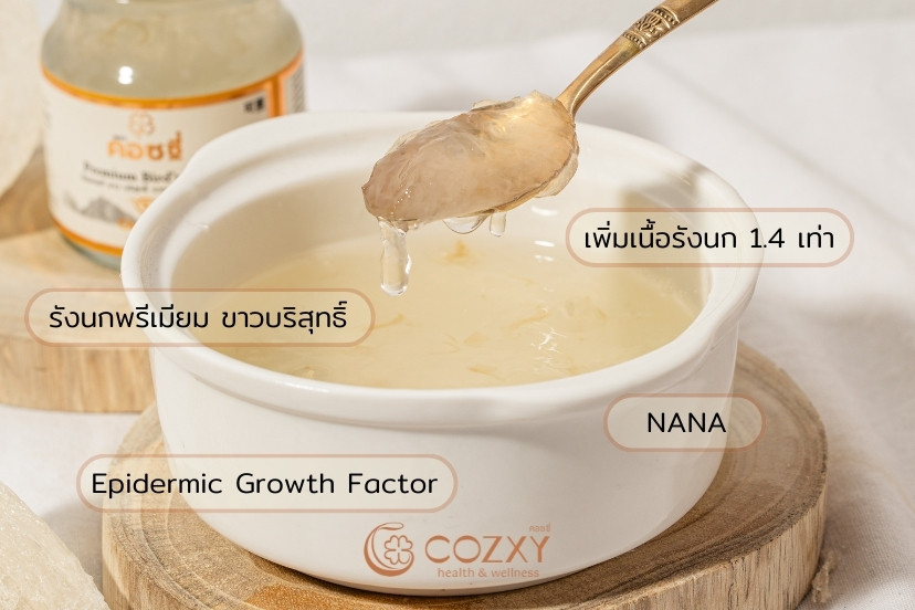 รังนกมีโปรตีน อีพิเดอร์มอล โกรท แฟคเตอร์Epidermal Growth Factor (EGF) มีหน้าที่กระตุ้นการสร้างผิวหนังใหม่ ซ่อมแซมเซลล์ผิวที่เสื่อมสลายทำให้ชั้นผิวใหม่ดูกระจ่างใสขึ้น ผิวดูชุ่มชื้น และสามารถป้องกันการเกิดริ้วรอยแห่งวัย