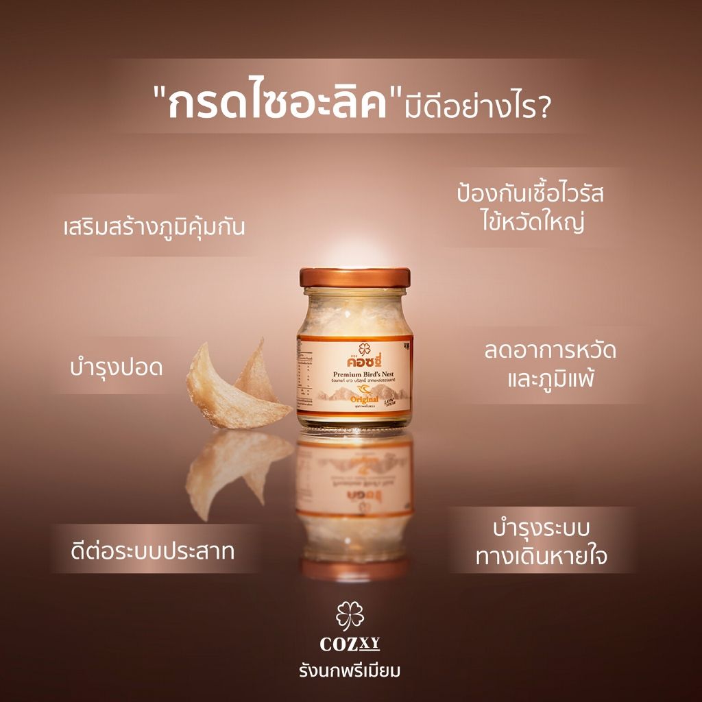 คอซซี่ รังนกจากแหล่งในประเทศไทย เป็นที่ยอมรับว่ามาจากแหล่งที่มีความอุดมสมบูรณ์ มีการควบคุมขั้นตอนการเก็บรังอย่างถูกต้อง ผ่านวิธีการคัดสรรเกรดรังนกให้ตรงตามมาตรฐาน คุณภาพดีมีไซอาลิค แอซิด และสารอาหารมีประโยชน์ที่คงคุณค่าไว้ในทุกๆ ขวด