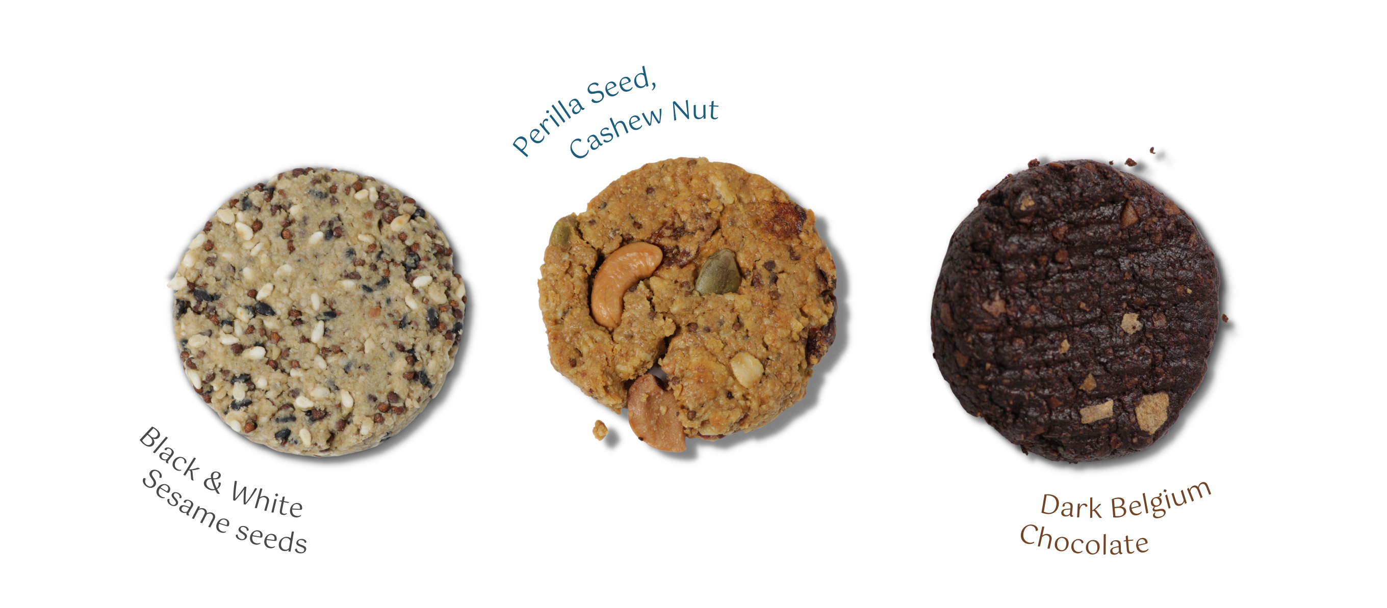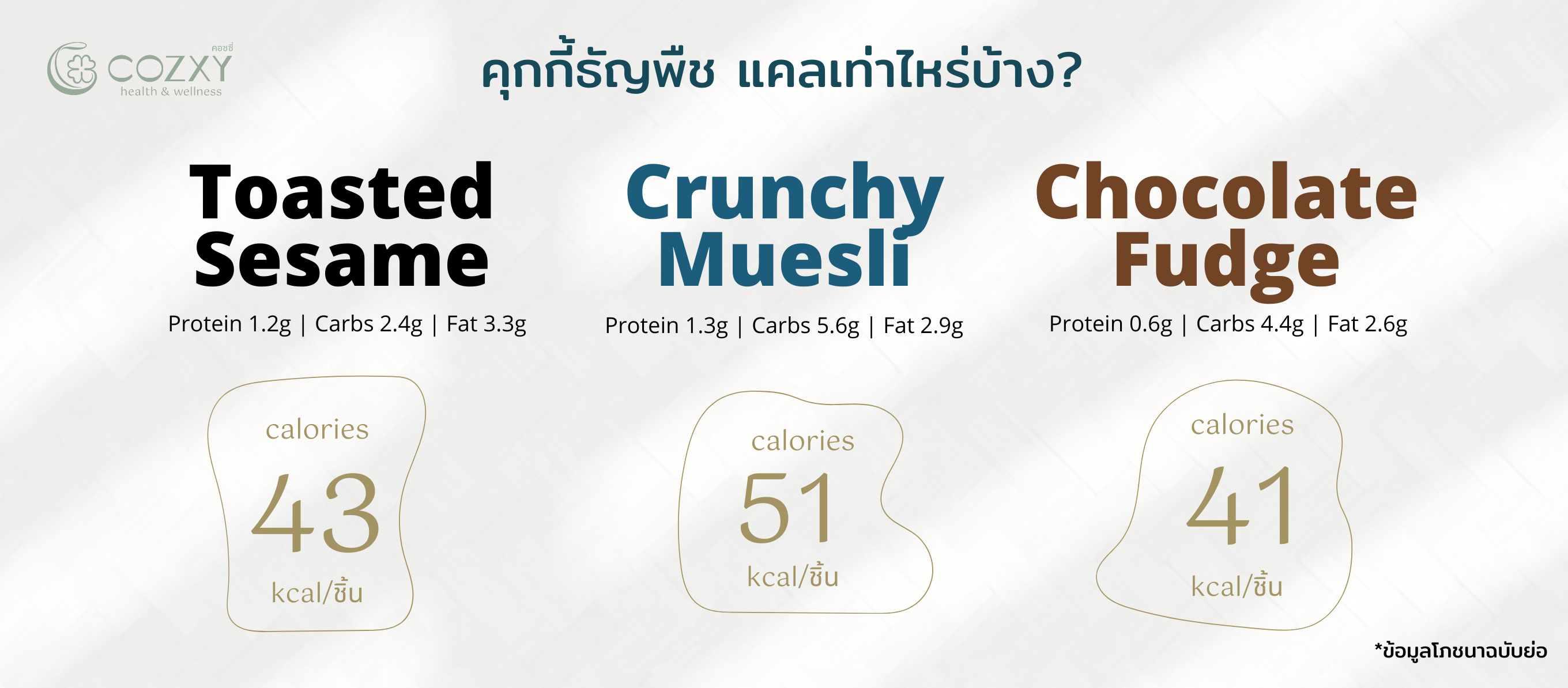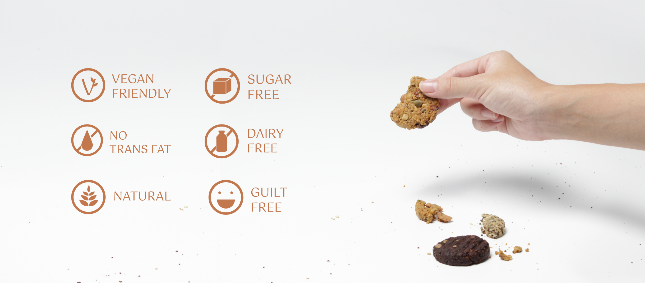 คุกกี้ธัญพืชไม่มีน้ำตาล vegan friendly มาพร้อมรสชาติที่คิดค้นมาอย่างลงตัว Crunchy Muesli ครั้นชี่มูสลี่ที่อัดแน่นไปด้วยถั่วหลากหลาย หวานธรรมชาติจากอินทผาลัม อบจนมีสีน้ำตาลทอง Chocolate Fudge ช็อกโกแลตฟัดจ์ มีประโยชน์และรสชาติเข้มข้นจากดาร์กช็อกโกแลตละมุนลิ้น Toasted Sesame โทสต์เซซามี่ หอมกรุ่นจากงาคุณภาพ 3 ชนิด ผสมผสานกันอย่างลงตัว เหมาะสำหรับทานกับชาต่างๆ เพลิดเพลินกับทุกคำ และยังได้รับสารอาหารที่มีคุณค่าจากวัตถุดิบธรรมชาติอีกด้วย