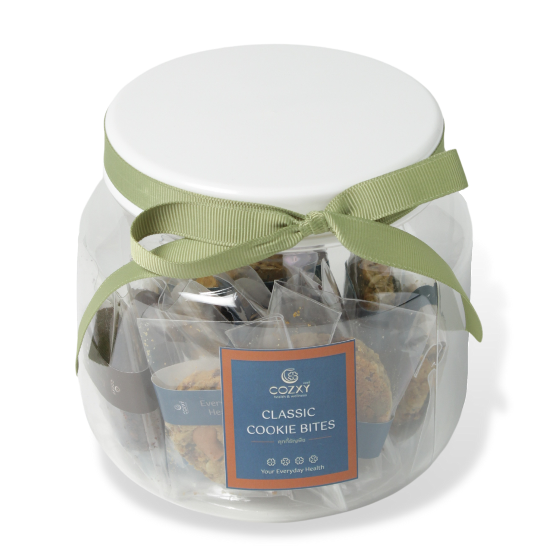 Cozxy Classic Cookie Bites Jar กระปุกคุกกี้ธัญพืช 210g กรุบกรอบด้วยวัตถุดิบคุณภาพ ไม่มีน้ำตาล และไม่มีส่วนผสมของนม เนย Vegan Friendly สามารถทานได้โดยไม่รู้สึกผิด 3 รสชาติที่ลงตัว ทั้ง Crunchy Muesli (ครันชี่มูสลี่), Chocolate Fudge (ช็อกโกแลตฟัดจ์) และ Toasted Sesame (โทสต์เซซามี่) หอม อร่อย รสชาติเข้มข้น เหมาะสำหรับทานเป็นอาหารว่าง คู่กับชาและกาแฟ และแบ่งกันทานระหว่างวัน