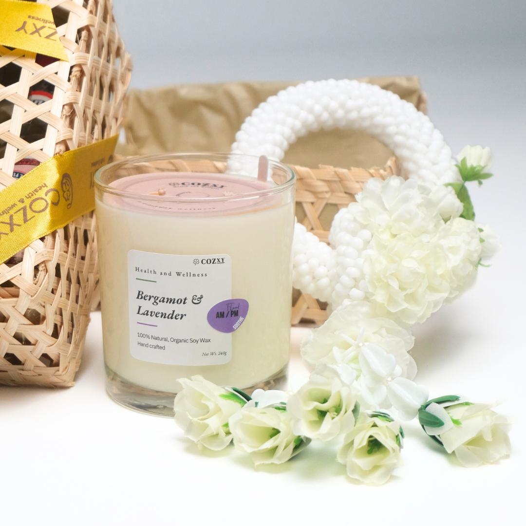 เทียนหอมไขถั่วเหลือง - Bergamot & Lavender กลื่นอายของดอกลาเวนเดอร์ที่มีสรรพคุณในการช่วยผ่อนคลาย และกลิ่นหอมของมะกรูดที่มอบกลิ่นที่อบอุ่นและสดชื่น บรรเทาอาการเครียด